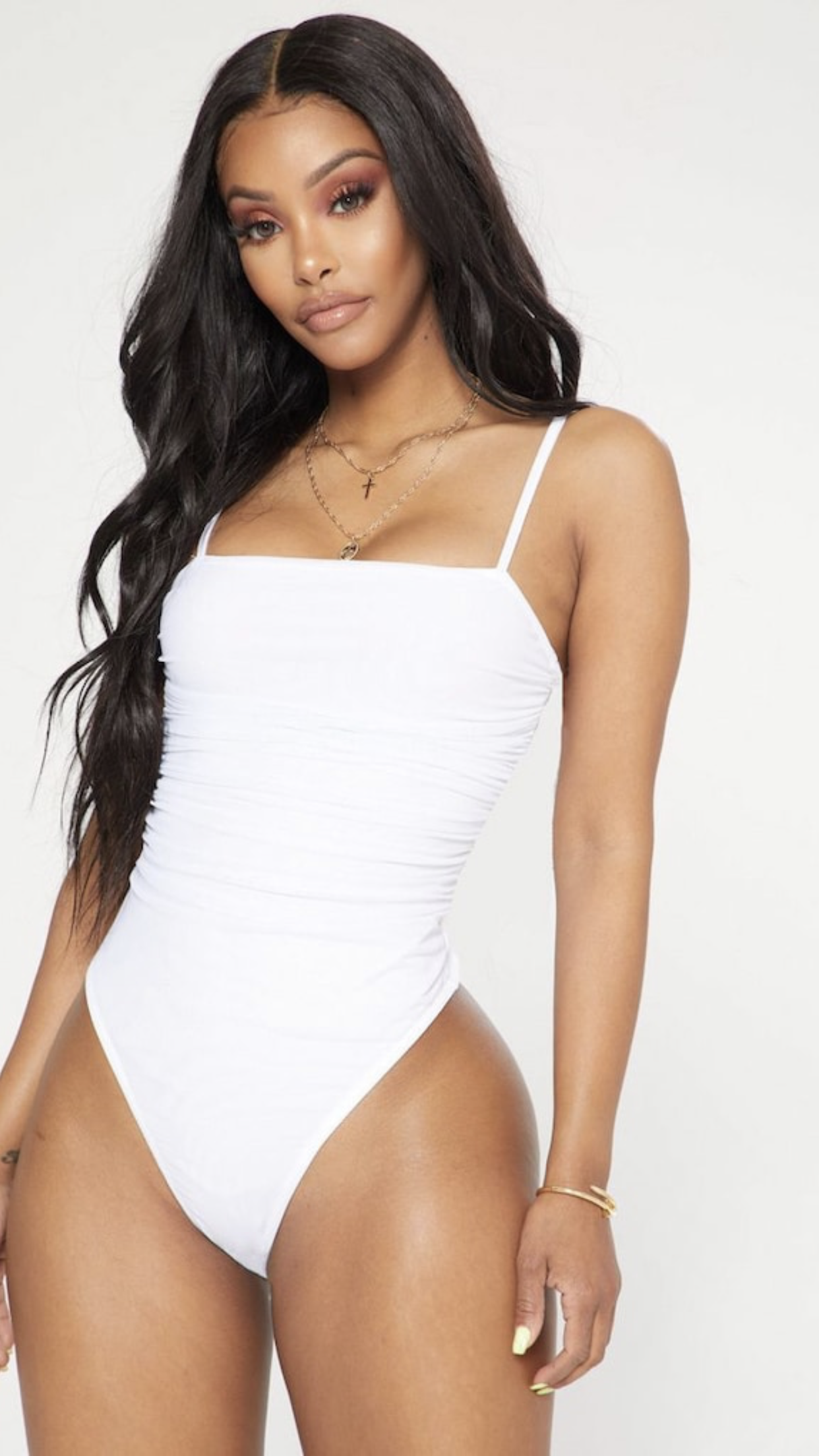 We are obsessing over mesh this season and this bodysuit is killing the sheer trend. Featuring a white lined mesh fabric with ruched detailing, thin shoulder straps and popper fastenings, team it with some cycling shorts and strappy heels for a night out with the girls.